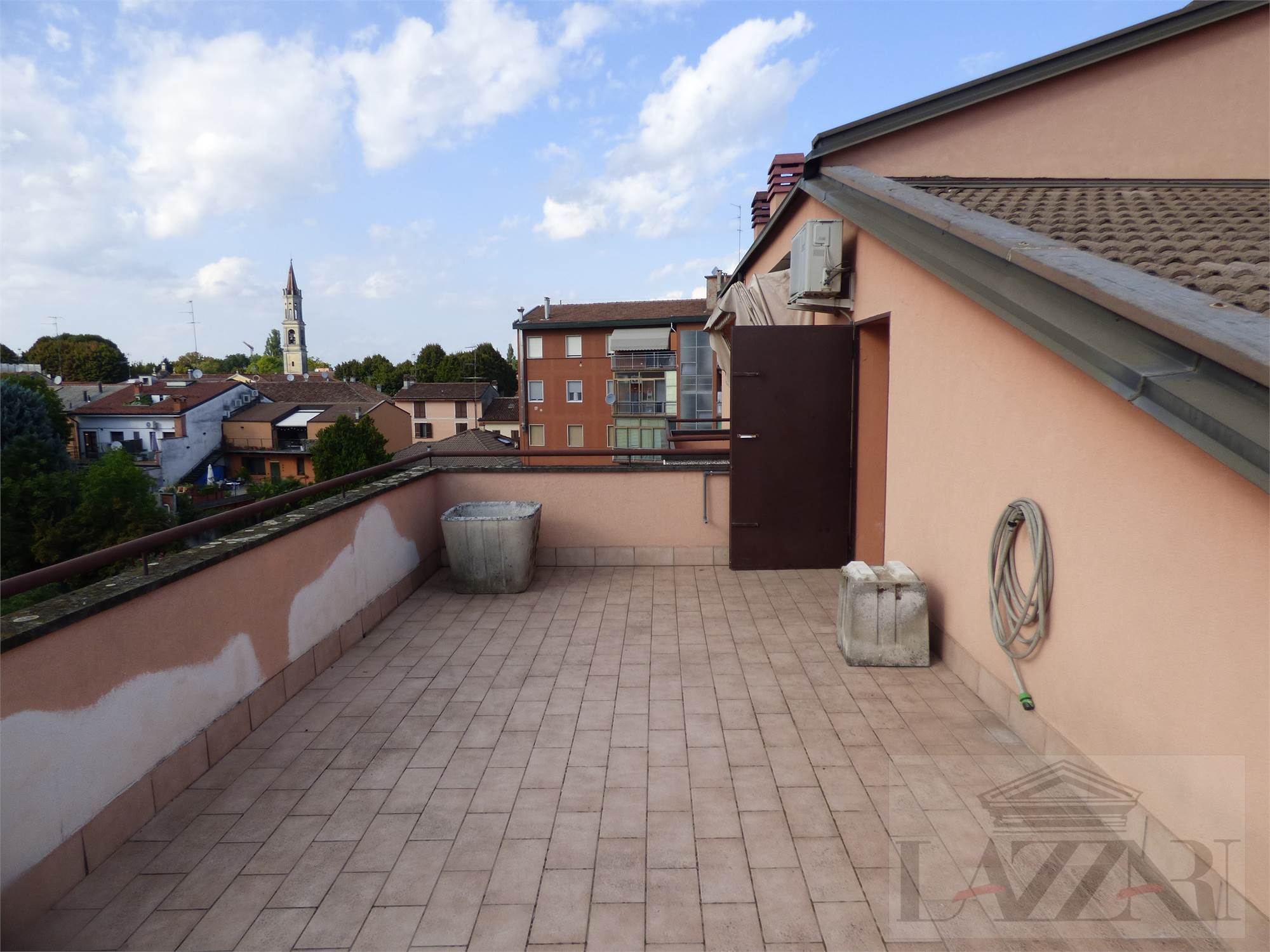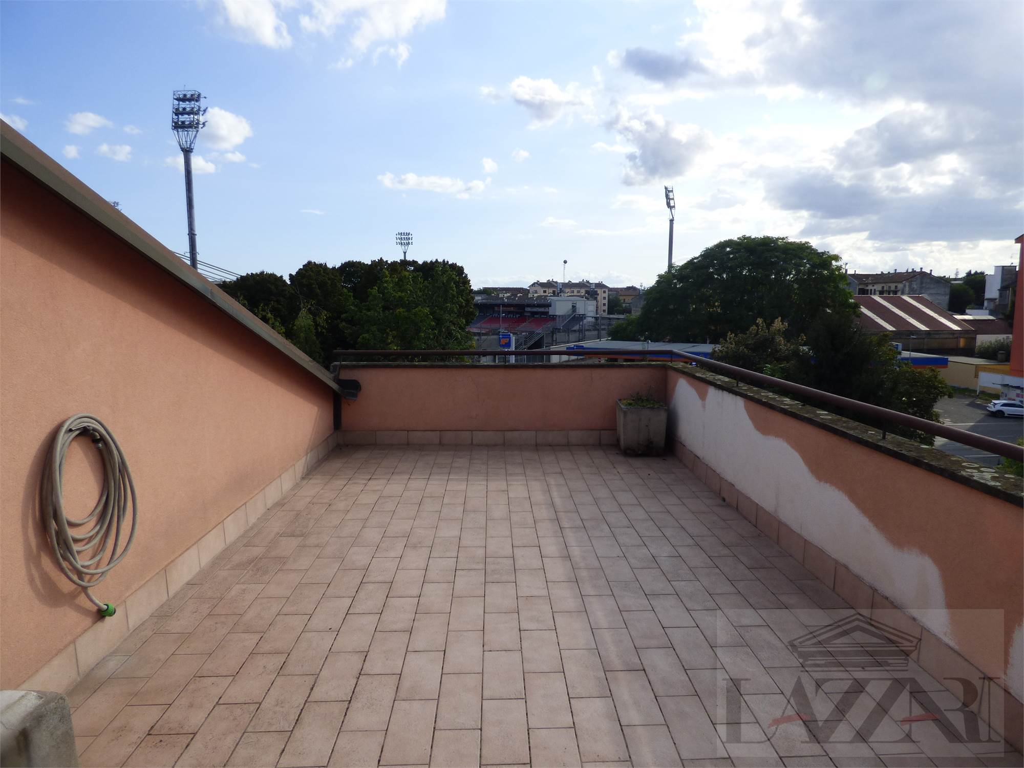 A Cremona in via Persico distante 300 metri da Porta Venezia, in elegante piccola palazzina di 12 appartamenti edificata nel 1984 con gradevole e ben tenuto giardino condominiale, proponiamo luminosissimo attico con esposizione a sud e ovest. L'appartamento (sino ad oggi utilizzato come ufficio) è posto al secondo piano servito da ascensore ed ha annesso un ampio vano mansardato al piano soprastante. E’ composto da ingresso con comodo ripostiglio, ampio soggiorno di circa 27 mq che essendo adiacente alla cucina abitabile di circa 11 mq permette con piccole opere di ricavare un moderno openspace di quasi 40 mq servito da un primo godibile terrazzo di ml 2,60 x 3,50; troviamo poi il corridoio/disimpegno che serve un primo servizio igienico/lavanderia con aspirazione forzata, una grande camera da letto matrimoniale di mq 16,40, due ampie singole (mq 09,00 e 09,60) ed il secondo bagno con finestra. Tramite una scala interna posta in soggiorno o dalla scala condominiale si arriva alla soprastante mansarda che copre tutto l’appartamento sottostante. La superficie utilizzabile ai fini abitativi è di circa 25 mq, la parte sottotetto/ripostiglio misura circa 17 mq e la superficie non praticabile circa 40 mq. Una splendida terrazza di 21 mq (circa 3,00 x 7,00) esposta a sud nella massima riservatezza completa l’appartamento. Le finiture risalgono all’epoca della costruzione e presentano pavimenti in ceramica in cucina e bagni e parquet nel soggiorno e nelle camere da letto. I serramenti sono in legno con doppio vetro, le porte in legno impiallacciato noce. L’impianto di riscaldamento è autonomo con caldaia murale con produzione di acqua calda e corpi scaldanti in ghisa. E’ presente impianto di aria condizionata canalizzato con bocchette in tutti i vani. Al piano interrato si trovano un vano cantina e due comodi box auto affiancati di normali dimensioni. La superficie totale di appartamento e mansarda è di circa 140 mq escluse le terrazze. La palazzina è in perfette condizioni, è ben abitata e presenta caratteristiche signorili. Bella vista aperta su tutti i lati. L’acquisto di entrambi i box non è vincolante. Richiesta Euro 235.000,00 con due box. Nonostante l'amore e la cura per gli immobili che proponiamo, ci possono essere delle imprecisioni nella pubblicazione delle fotografie e nel testo. Per questo motivo, tali annunci non costituiscono un accordo formale e ogni particolare relativo alla proposta verrà verificato in fase contrattuale. Per ulteriori informazioni e per fissare una visita potete telefonare ai numeri 037235400 – 3313814467. Dovete vendere il vostro immobile? Volete una valutazione? Non affidatevi a sconosciuti. Lazzari s.a.s. dal 1981 l’immobiliare a Cremona. www.immobiliarelazzari.it